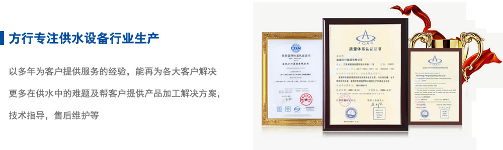 鹽城方行集團有限公司秉承“務實、誠信、拼搏、創(chuàng)新”的企業精神,經歷了近數十年的歷程取得了跨越式的發(fā)展。高起點才會有更高的品質,優(yōu)雅的環(huán)境,先進的設 備,高效的團隊,造就了一批批優(yōu)質的產品。堅持質量、用戶至上的宗旨,公司全面通過了ISO國際質量體系認證,是制造供水成套設備廠家 之一。經悉心打造,已享有較高的知名度,產品遍布全國,不斷研發(fā)全新產品,滿足消費者的需求 | |